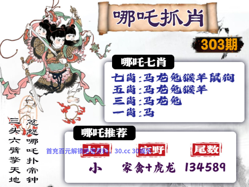 | 303期: ①七肖中特:马龙兔猴羊鼠狗 ②大小中特:小数 ④精准六尾:134589 |