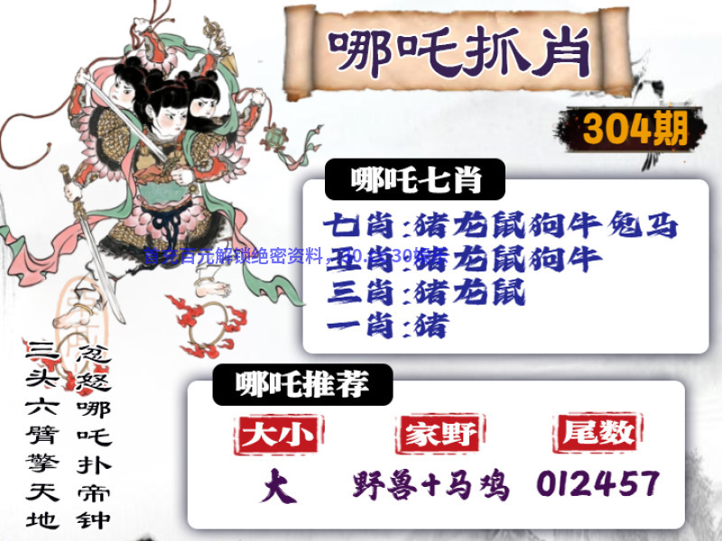 | 304期: ①七肖中特:猪龙鼠狗牛兔马 ②大小中特:大数 ③家野+2肖:野兽+马鸡 |