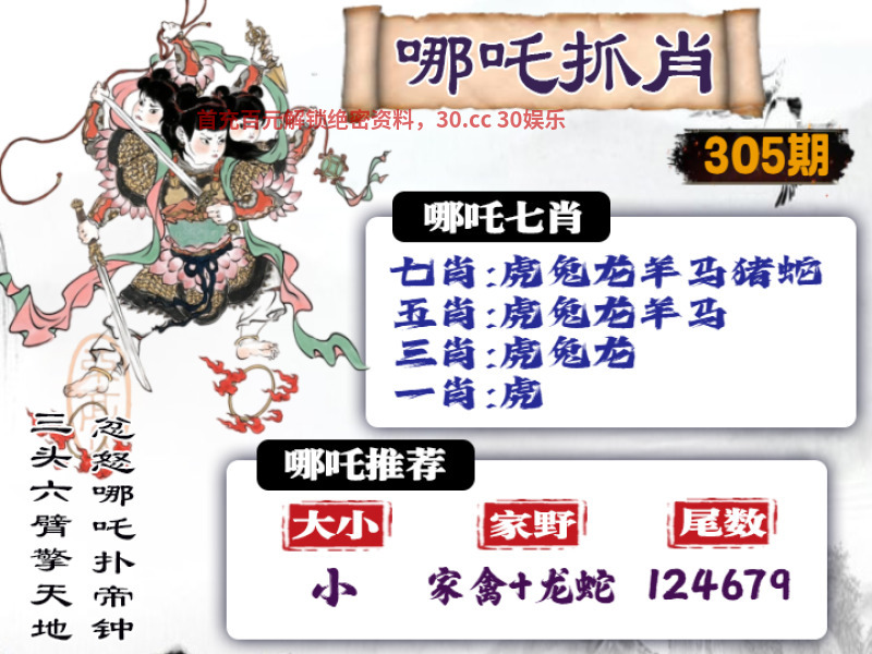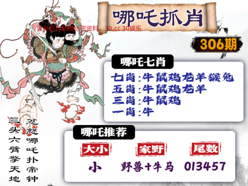 | 306期: ①七肖中特:牛鼠鸡龙羊猴兔 ②大小中特:小数 ③家野+2肖:野兽+牛马 ④精准六尾:013457 |
